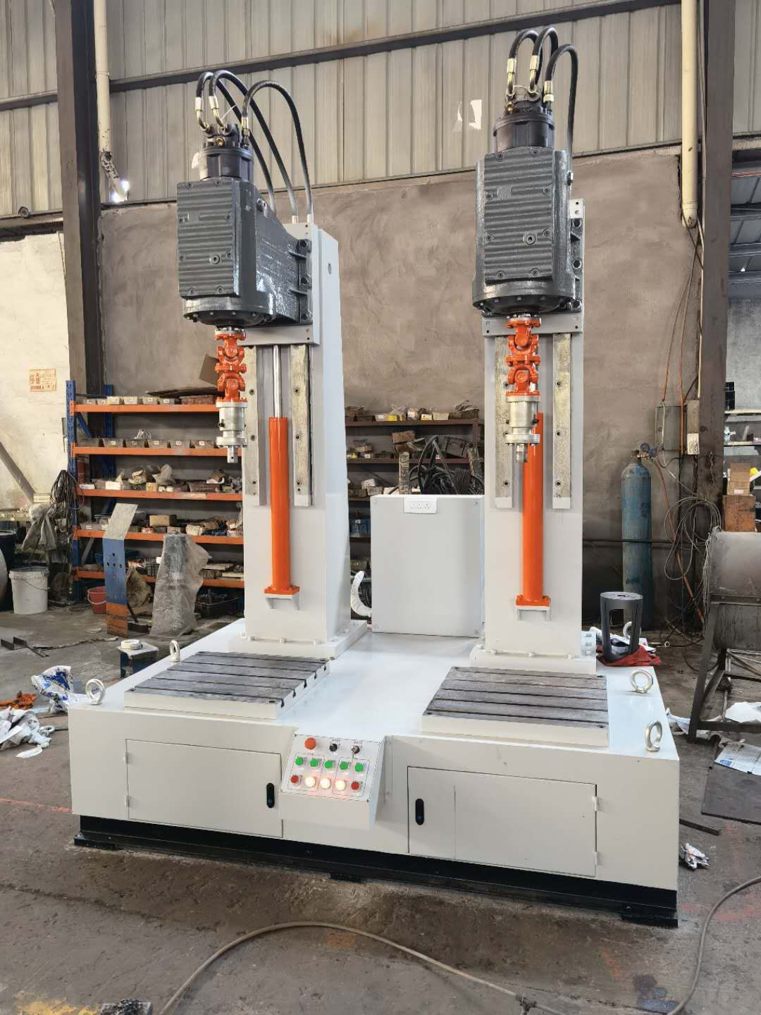 JLX型旋塞閥研磨機(jī)是針對(duì)硬密封旋塞閥密封面的研磨而精心研制的專(zhuān)用設(shè)備,該設(shè)備采用獨(dú)創(chuàng)的正轉(zhuǎn)360度和反轉(zhuǎn)360度,最主要的是正反轉(zhuǎn)一圈還有上下起跳5次功能方式,上下起跳功能就是解決了閥體密封面和閥芯塞密封面不會(huì)咬傷和損壞。獲得極高的加工精度、表面質(zhì)量以及批量加工的質(zhì)量一致性。JLX型旋塞閥研磨機(jī)分為一工位和兩工位研磨機(jī)、一工位研磨機(jī)和兩工位研磨機(jī)供用戶(hù)可根據(jù)要求選配。該設(shè)備通過(guò)液壓馬達(dá)來(lái)控制轉(zhuǎn)速旋轉(zhuǎn),用液壓流量來(lái)控制轉(zhuǎn)速快與慢,根據(jù)閥門(mén)口徑大小和材質(zhì)來(lái)調(diào)整轉(zhuǎn)速快慢,這樣才閥體和閥芯塞配合度為一致。用戶(hù)根據(jù)被研磨閥體的工藝要求,選擇合適的研磨劑,粗磨和精磨相結(jié)合,或閥體與閥芯塞浮動(dòng)對(duì)磨。研磨頭通過(guò)液壓油缸來(lái)上升下降來(lái)實(shí)現(xiàn)。齒輪箱與主軸采用萬(wàn)向節(jié)與伸縮桿鏈接,旋塞閥閥體和閥芯塞的垂直通過(guò)萬(wàn)向節(jié)來(lái)變動(dòng),閥體和閥芯塞用伸縮桿來(lái)控制密封面的輕重來(lái)實(shí)現(xiàn)。裝夾誤差或其它工藝誤差。研磨劑根據(jù)用戶(hù)來(lái)選擇。JLX型旋塞閥研磨機(jī)由立柱機(jī)架、導(dǎo)軌及升降機(jī)構(gòu)、齒輪箱旋轉(zhuǎn)機(jī)構(gòu)、裝夾機(jī)構(gòu)等組成,旋轉(zhuǎn)機(jī)構(gòu)的旋轉(zhuǎn)中心線相互垂直。立柱與齒輪箱底板的升降功能通過(guò)液壓油缸來(lái)實(shí)現(xiàn),通過(guò)按鈕可進(jìn)行上升或下降。