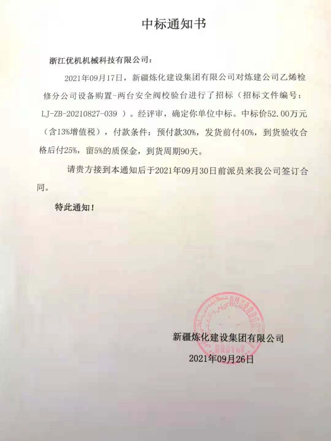 近期,新疆煉化建設(shè)集團有限公司發(fā)出中標(biāo)通知書,宣布通知浙江優(yōu)機機械科技有限公司,二次添加設(shè)備購置項目-兩套安全閥校驗臺,經(jīng)評審確定中標(biāo)(招標(biāo)文件編號:LJ-ZB-20210827-039),合計一期和二期閥門檢測校驗設(shè)備總數(shù)達到11臺(套)金額貳佰多萬,該項目是浙江優(yōu)機機械科技有限公司主營產(chǎn)品進入中石油樣本項目。